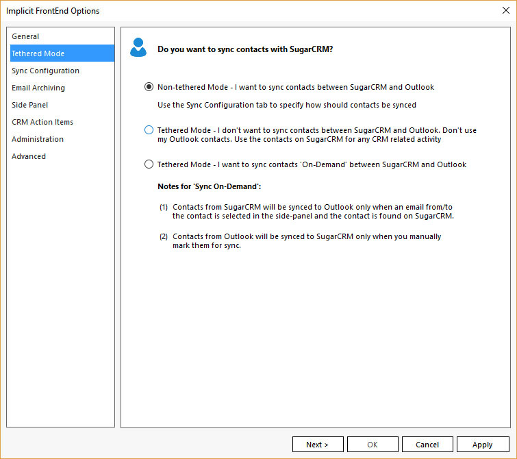direction, what filters to apply and which records to sync etc. - Tethered Mode – how to sync contacts
