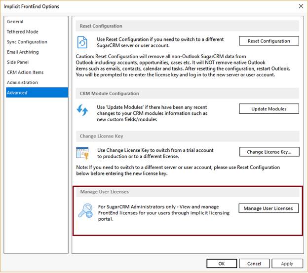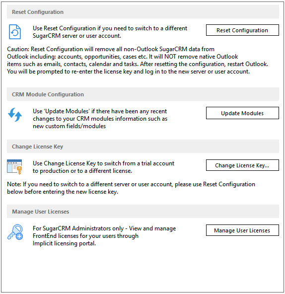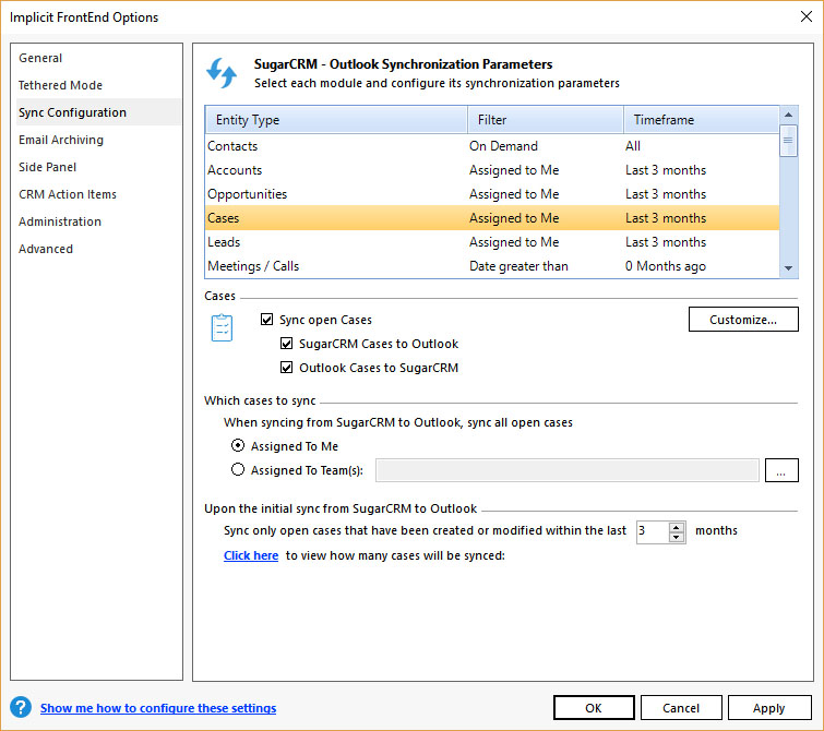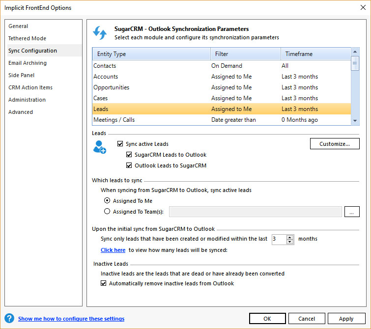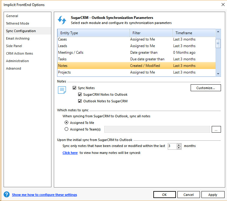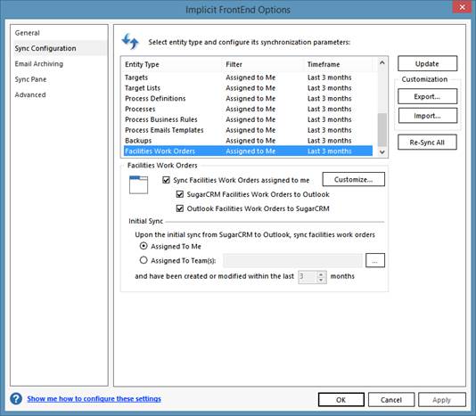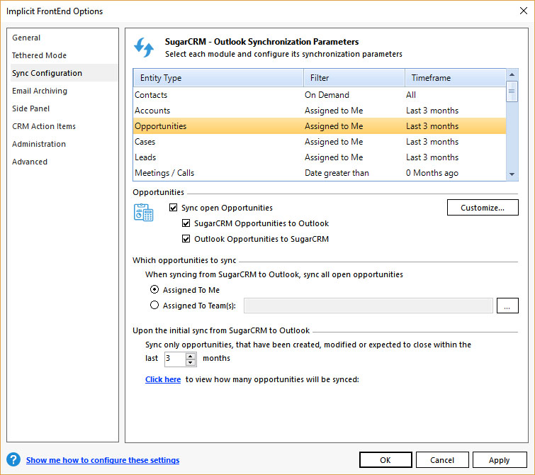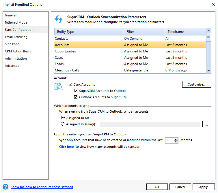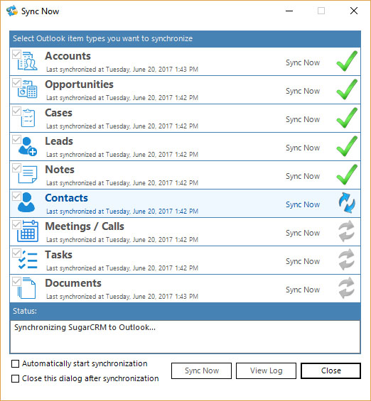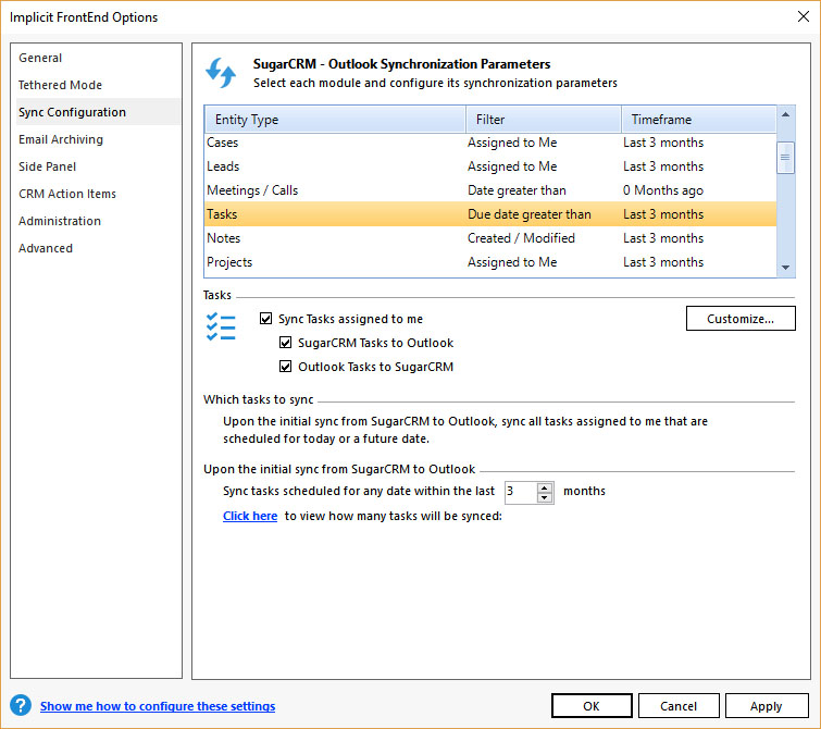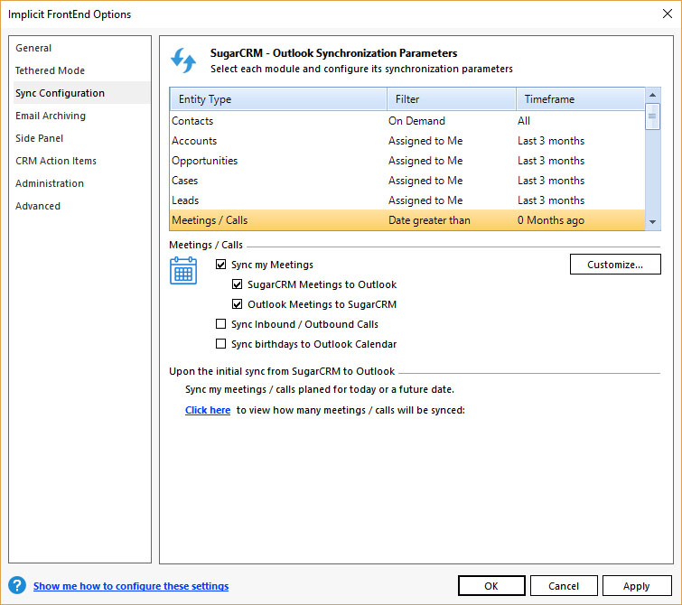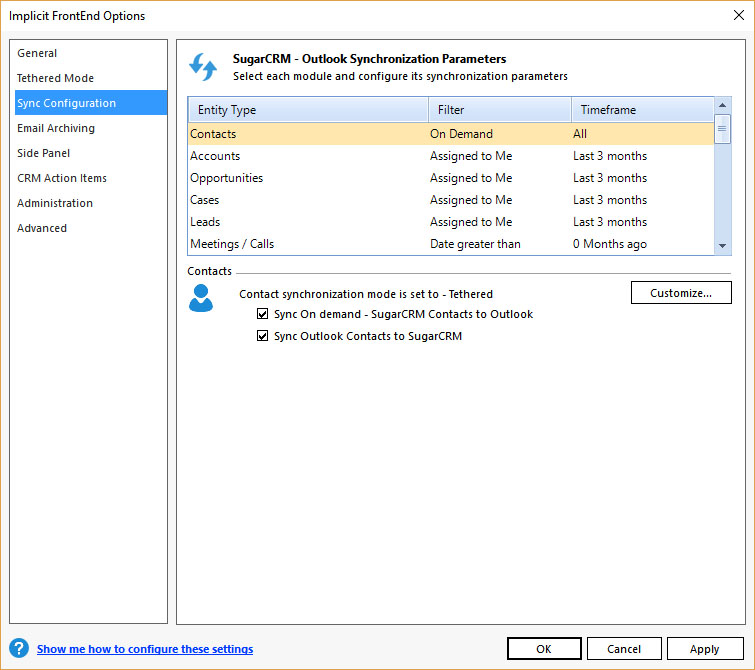 - Sync Configuration – Which modules are to be synced, in which