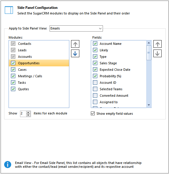- Side panel – Which modules to show on the side panel and how many