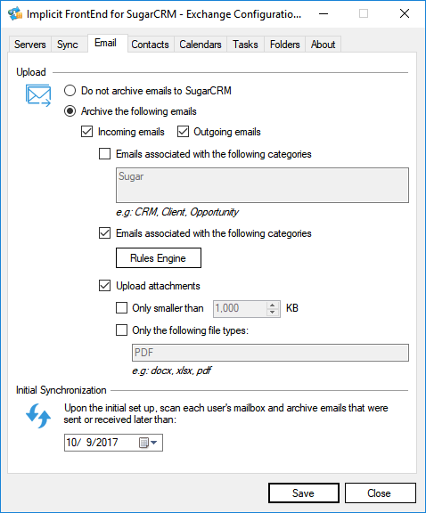 • Archive / Do not archive email to SugarCRM – Turn on/off email archive functionality