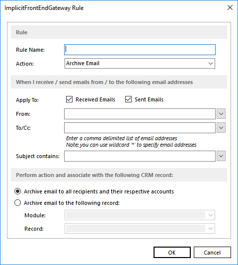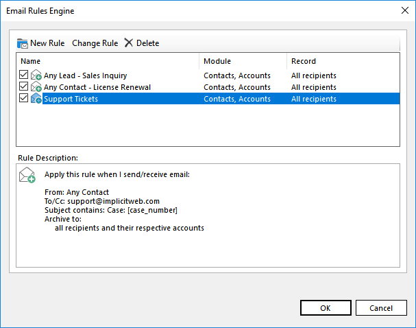 • Any Contact – Select ‘Any Contact’ if you would like to create a rule that applies to emails from/to any CRM contact